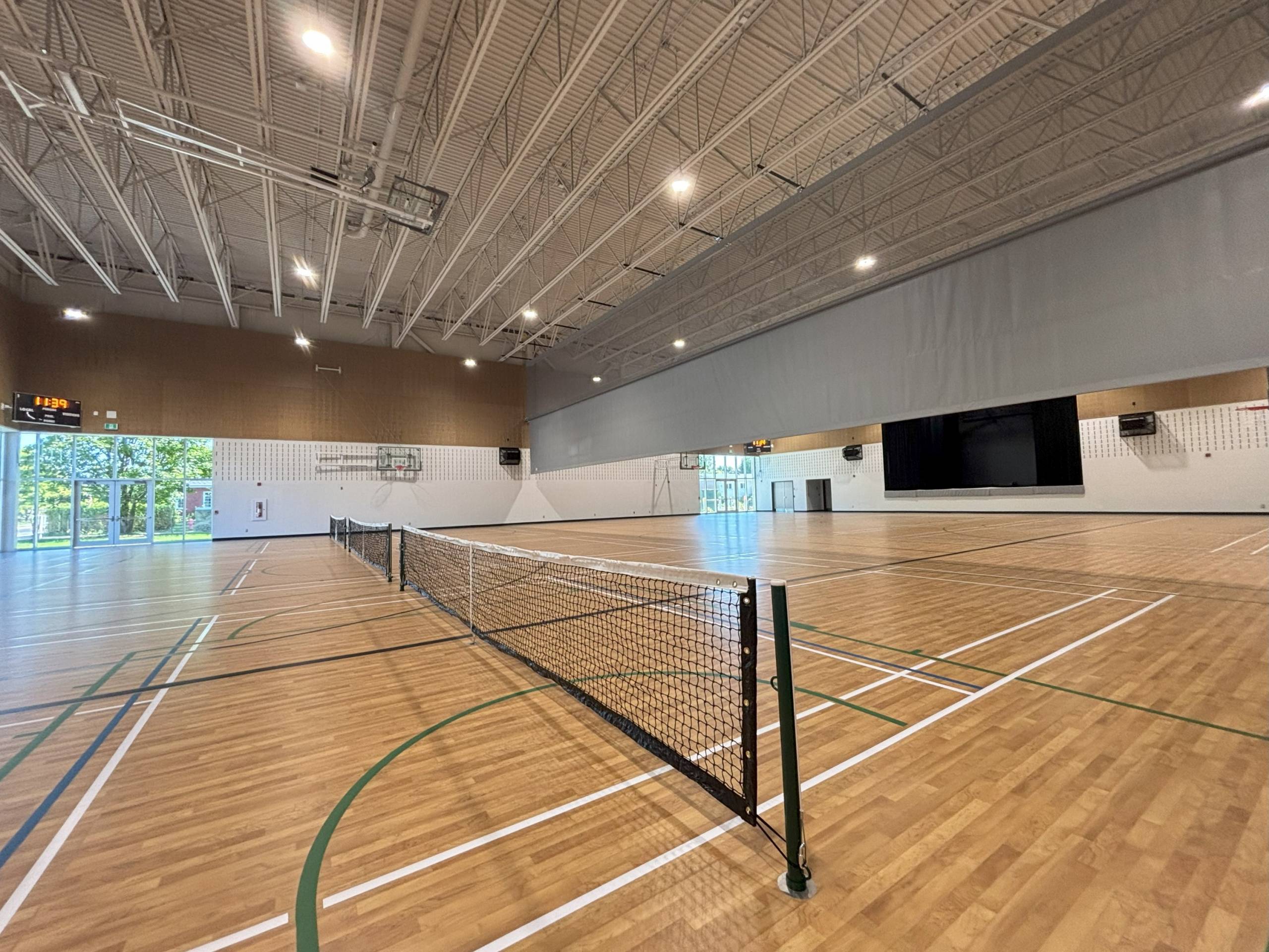 Le gymnase, où l’on peut jouer au basketball, pickleball et badminton, peut se transformer en salle de spectacles ou de conférences, avec sa scène et sa capacité de 500 personnes.