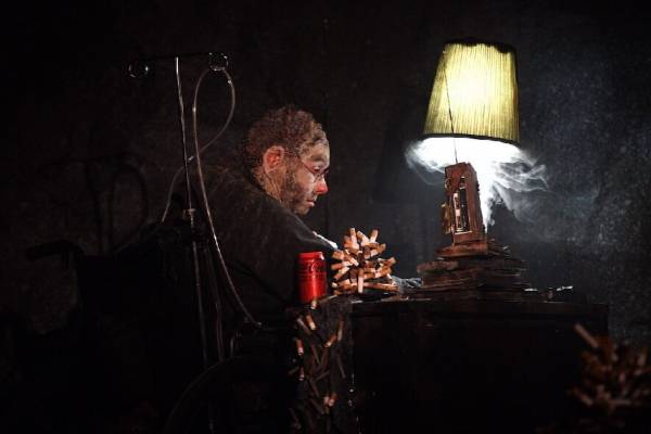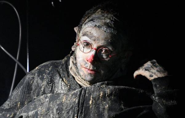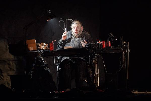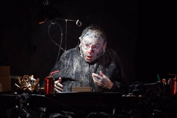 Sur scène, l’actrice est méconnaissable : un costume noir crasseux reposant sur un ventre rebondi, un crâne dégarni tout aussi sale que le pâle visage qui laisse poindre un nez écarlate, de petites lunettes rouges, rondes et délicates, rappelant inévitablement celles du metteur en scène.