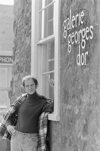 Georges Dor à sa galerie, vers 1975. Archives nationales à Montréal, fonds Antoine Desilets (P697, S1, SS1, SSS4, D62, P576). Photo : Antoine Desilets.