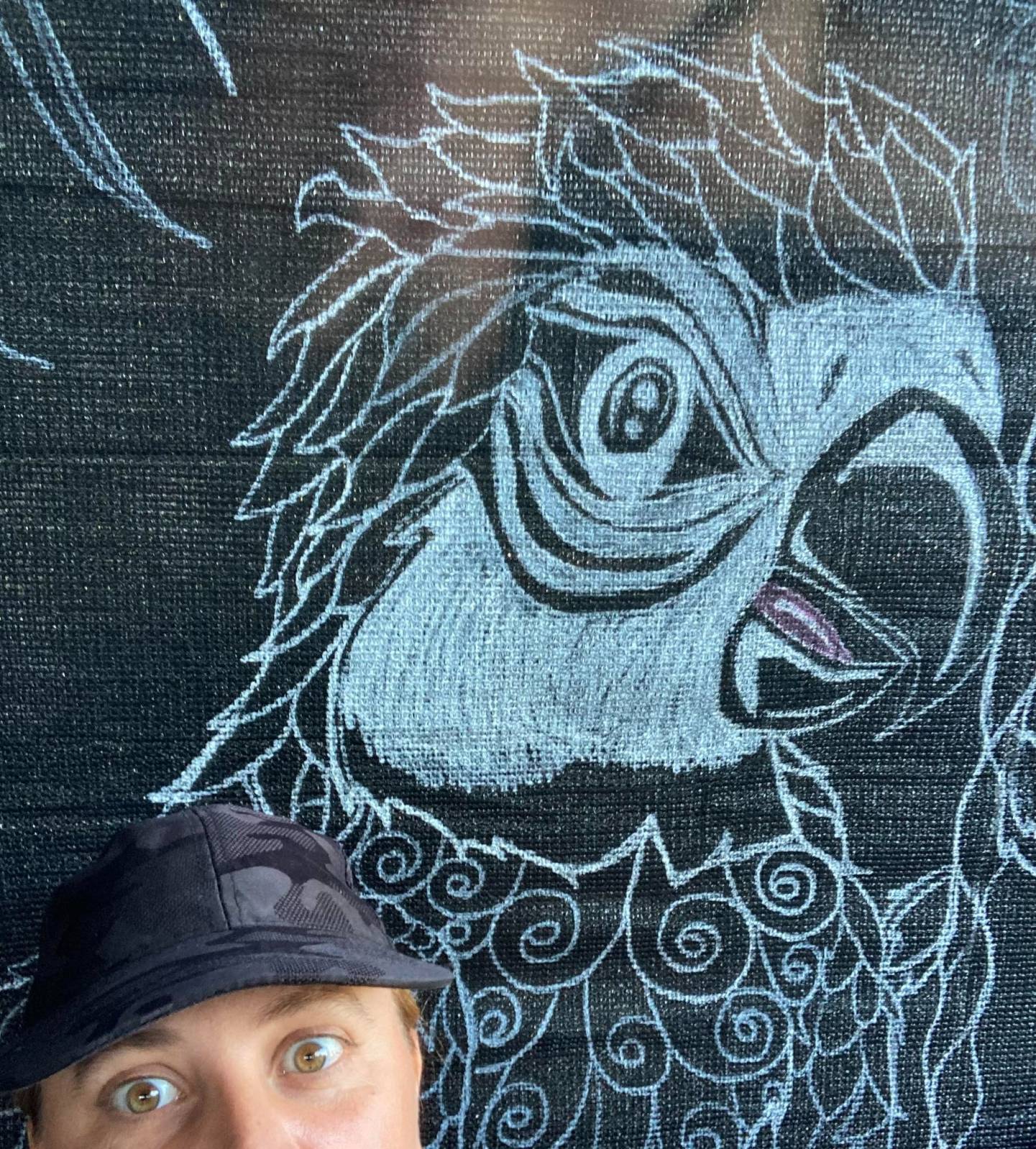 Sur sa page Facebook, Peggy Gendron Kin a voulu donner «petite idée de la taille réelle du perroquet sur la murale collective qui sera colorée» lors de l’événement. (Photo tirée de sa page Facebook)