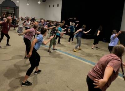 Ça travaille fort, dans le Foyer Jean-Louis Millette du Théâtre de la Ville (TDLV). Une cinquantaine de danseurs amateurs exécutent les mouvements d’une chorégraphie qu’ils apprennent graduellement depuis quelques semaines, suivant les indications du chorégraphe Sylvain Émard, en action sur une petite scène. Petit Continental en cours de préparation.