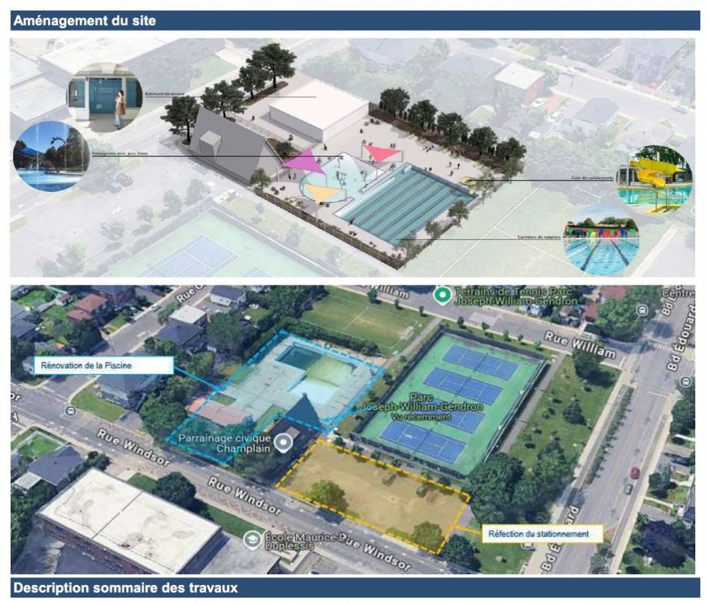 Le nouveau complexe comprendra une piscine extérieure avec rampe d’accès universel, un bâtiment de service avec vestiaires inclusifs, une pataugeoire à deux niveaux avec jeux d’eau et entrées de type plage, ainsi qu’un bassin de six corridors pouvant accueillir jusqu’à 400 baigneurs. Le projet prévoit aussi des aires de détente ombragées, une promenade, un espace récréatif ouvert sur le quartier, de même qu’un système de rétention des eaux pluviales et la réfection du stationnement existant.