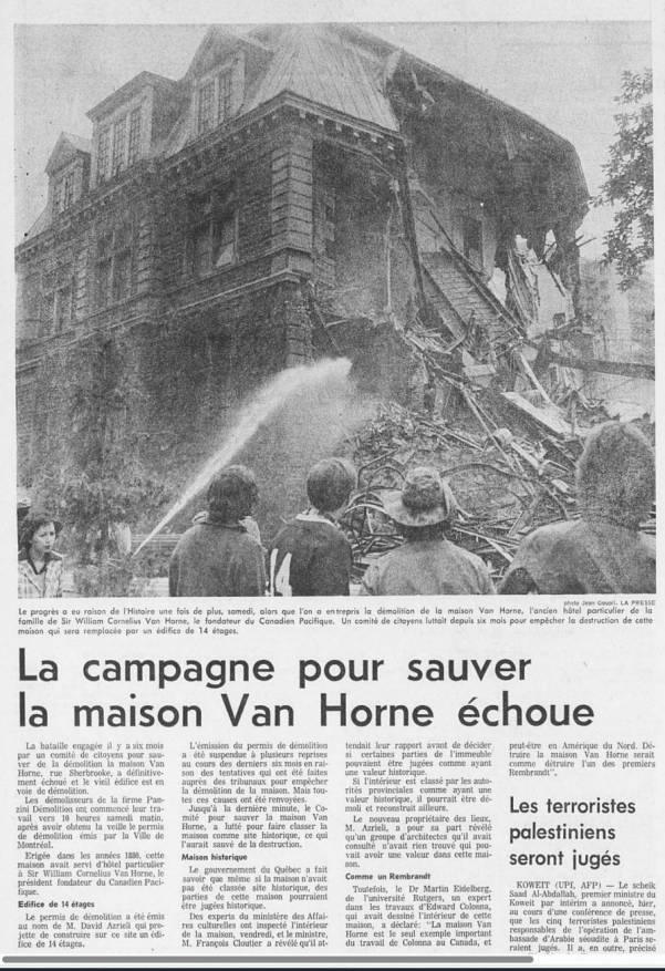 En 1973, la démolition de la Maison Van Horne sous l’administration du maire Jean Drapeau tombe sous le pic des démolisseurs au grand dam des amoureux du patrimoine. Cette démolition devient un événement charnière dans le mouvement pour la protection du patrimoine bâti, qui mènera à la création de Sauvons Montréal et d’Héritage Montréal.