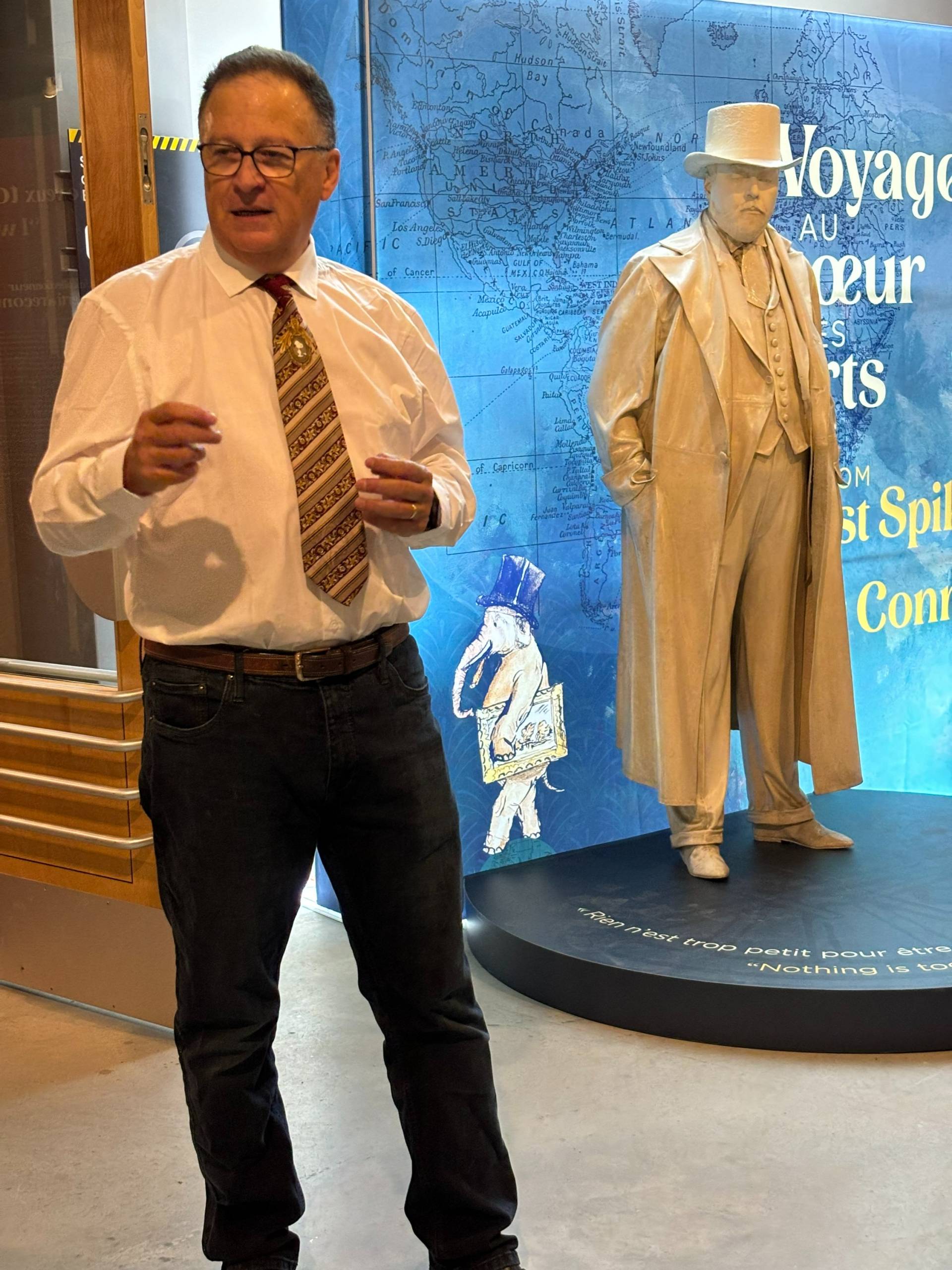 Sir William Cornelius Van Horne semble écouter les explications du conservateur d’Exporail, Jean-Paul Viaud. (Photo: Le Courrier du Sud – Sylvain Daignault)