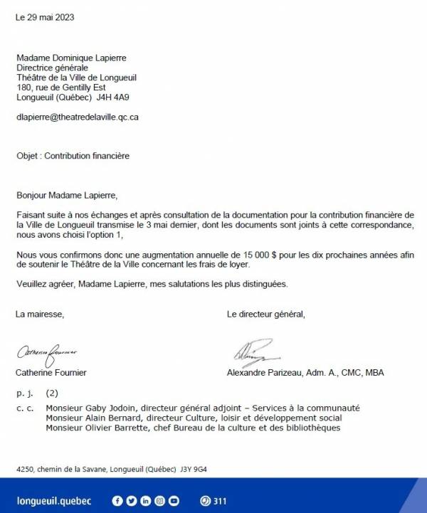 La lettre en question datée du 29 mai 2023 dans laquelle la mairesse de Longueuil confirme au Théâtre de la Ville une augmentation annuelle de 15 000 $ pour les dix prochaines années afin de le soutenir concernant les frais de loyer. (Photo: sommaire décisionnel de la Ville de Longueuil)
