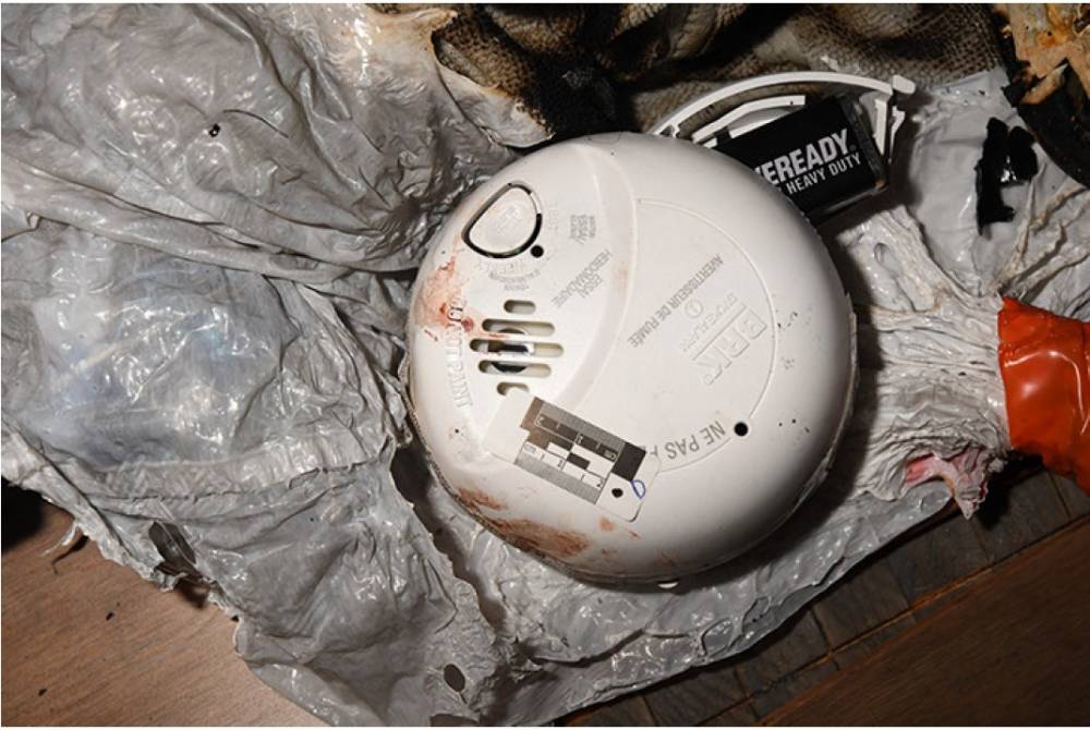 Des traces de sang ont été trouvées sur les détecteurs de fumée qui était dans le foyer d’incendie. (Photo tirée de la preuve)