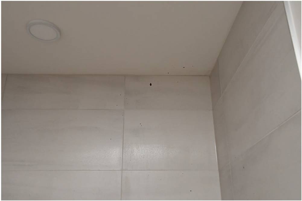 Des gouttes de sang ont été projetées jusqu’au plafond de la salle de bain. (Photo tirée de la preuve)