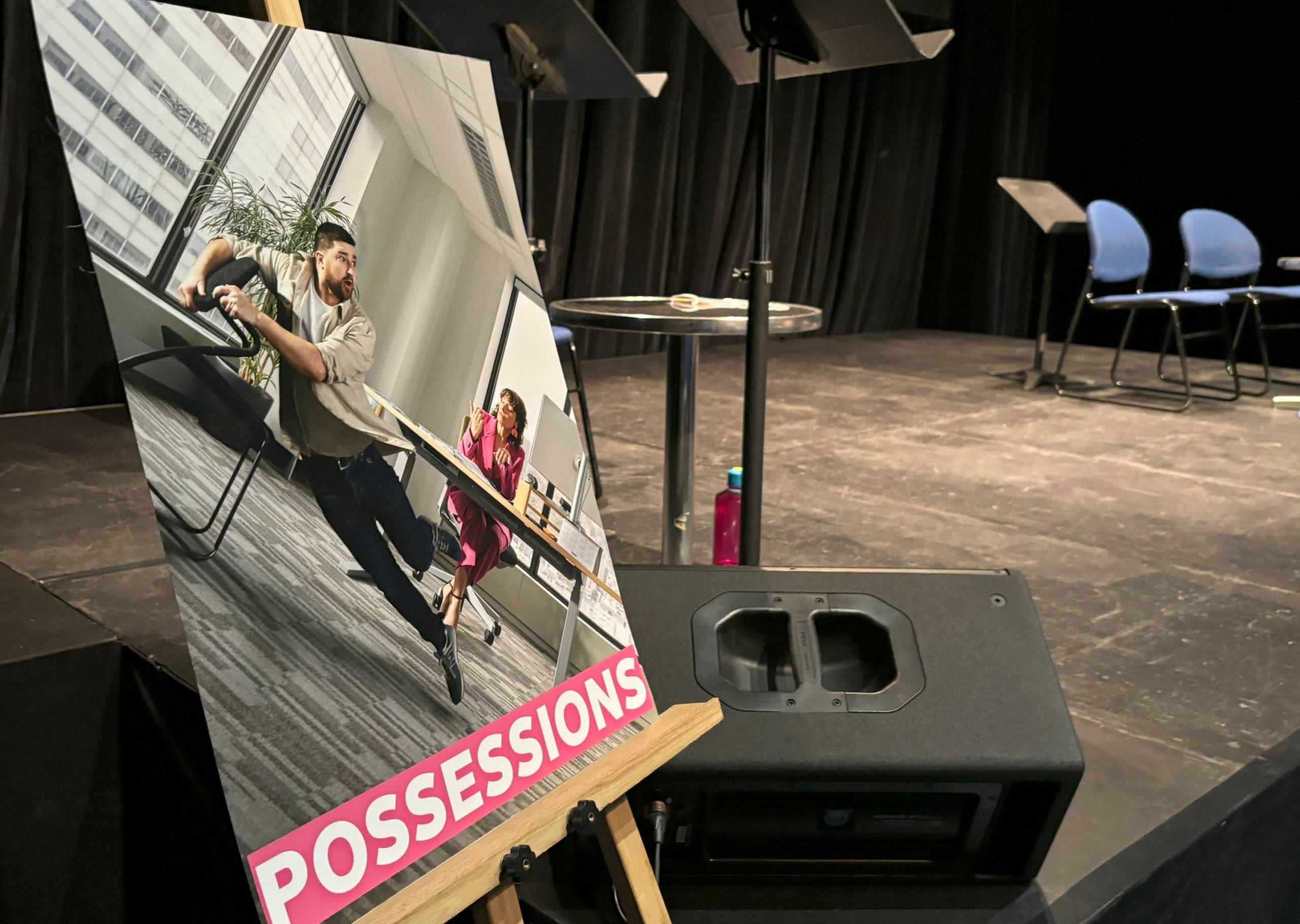 Sur la petite scène du Studio A du Théâtre de la Ville sont assis les acteurs Marc-André Thibault et Marie-Hélène Thibault, ainsi que la metteure en scène Catherine Vidal et la conceptrice de décors et costumes Carol-Anne Bourgon-Sicard. Devant, quelques dizaines de diffuseurs attentifs à cette courte immersion dans une production théâtrale dont le processus de création en est encore à ses balbutiements.