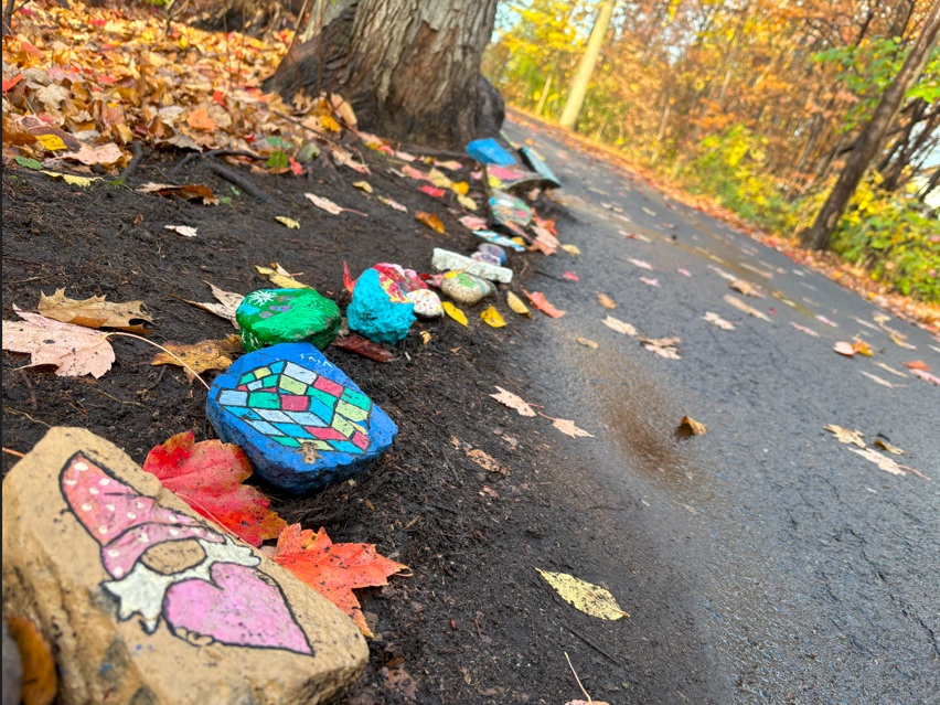 On y retrouve des pierres recouvertes d’arc-en-ciel, de personnages, de logo d’équipes de hockey, de fleurs, entre autres, avec parfois le nom de son auteur.