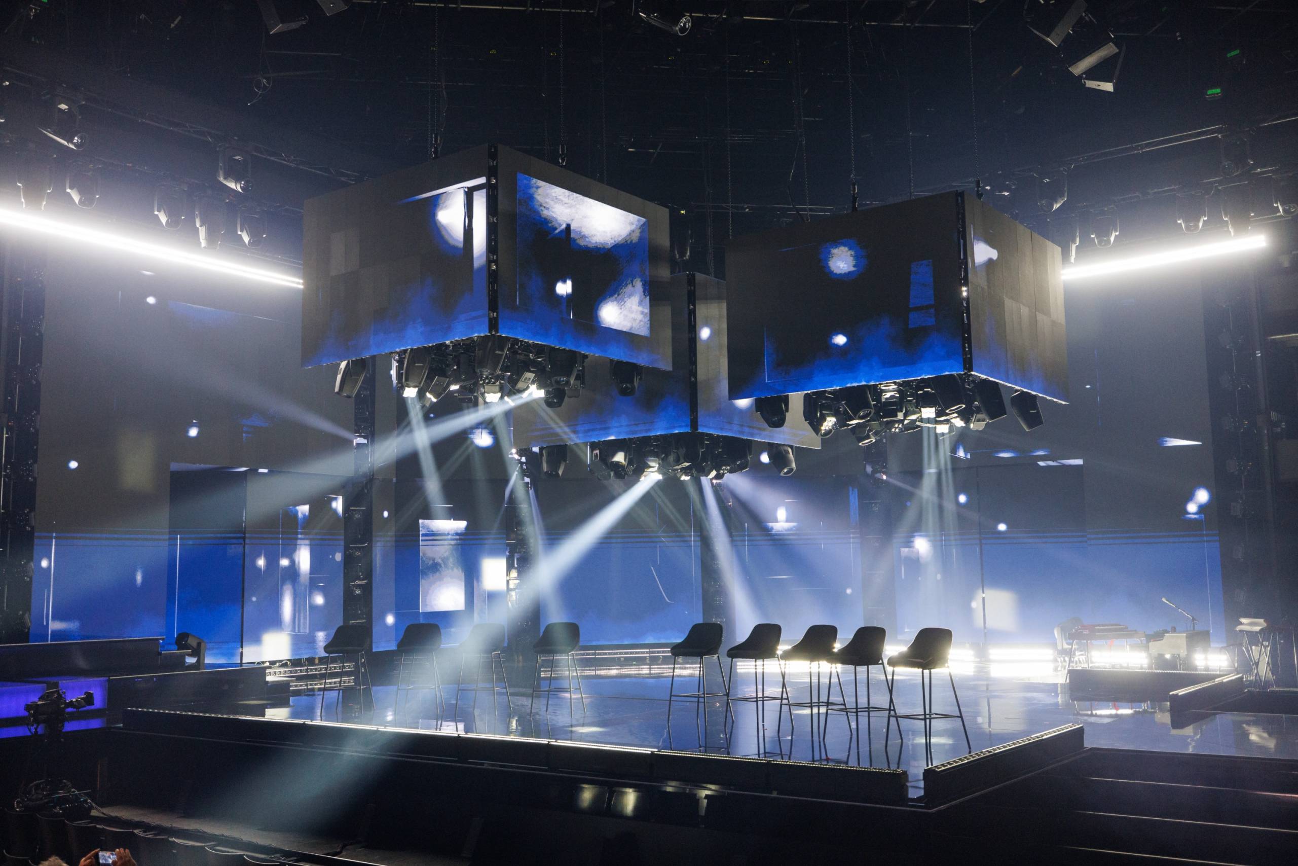 En plus d’un parterre et de gradins, deux rangées de balcons entourent la scène. Celle-ci est un peu plus petite que celle de 2022. Si la scène est plus intime, le décor demeure grandiose, avec ses nombreux écrans et ses immenses cubes d’éclairage entourés d’écrans qui descendent du plafond.