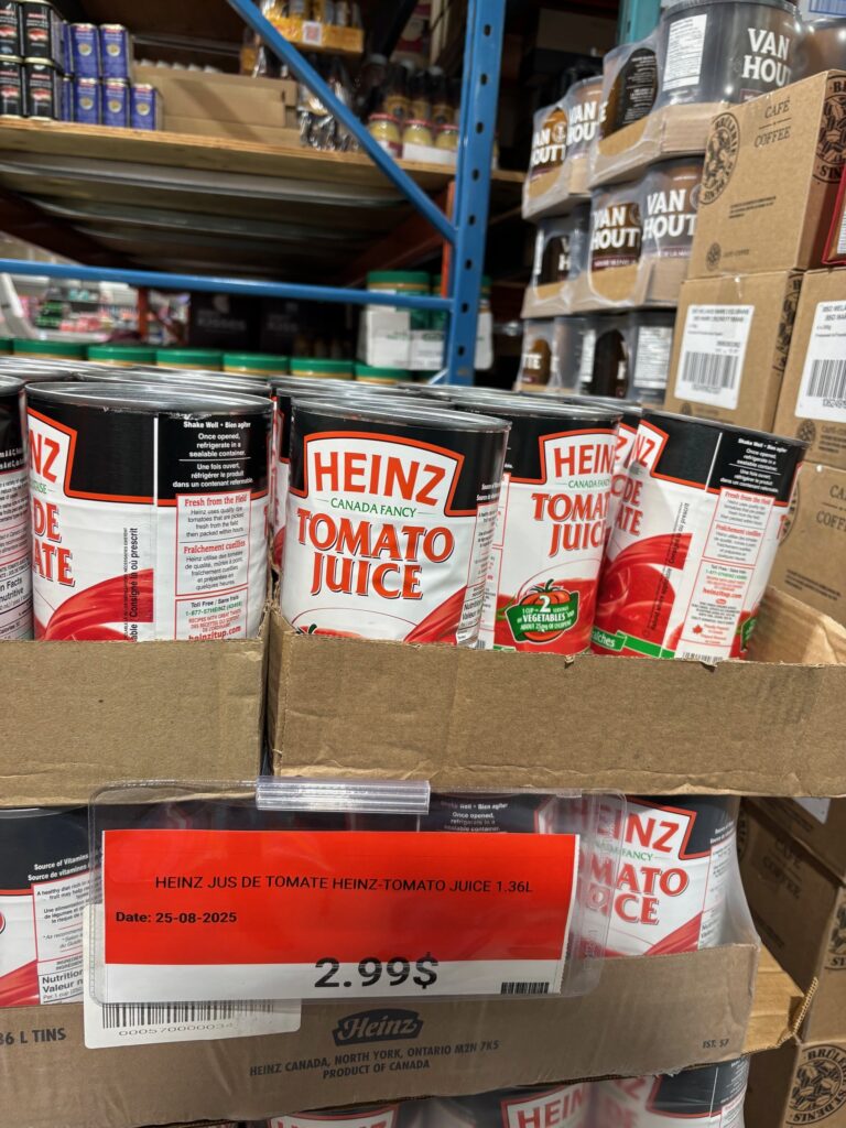 Au bout d’une allée, des conserves de jus de tomate sont offertes, à l’achat de 2, la moitié du prix de l’offre actuelle dans un magasin grande surface.